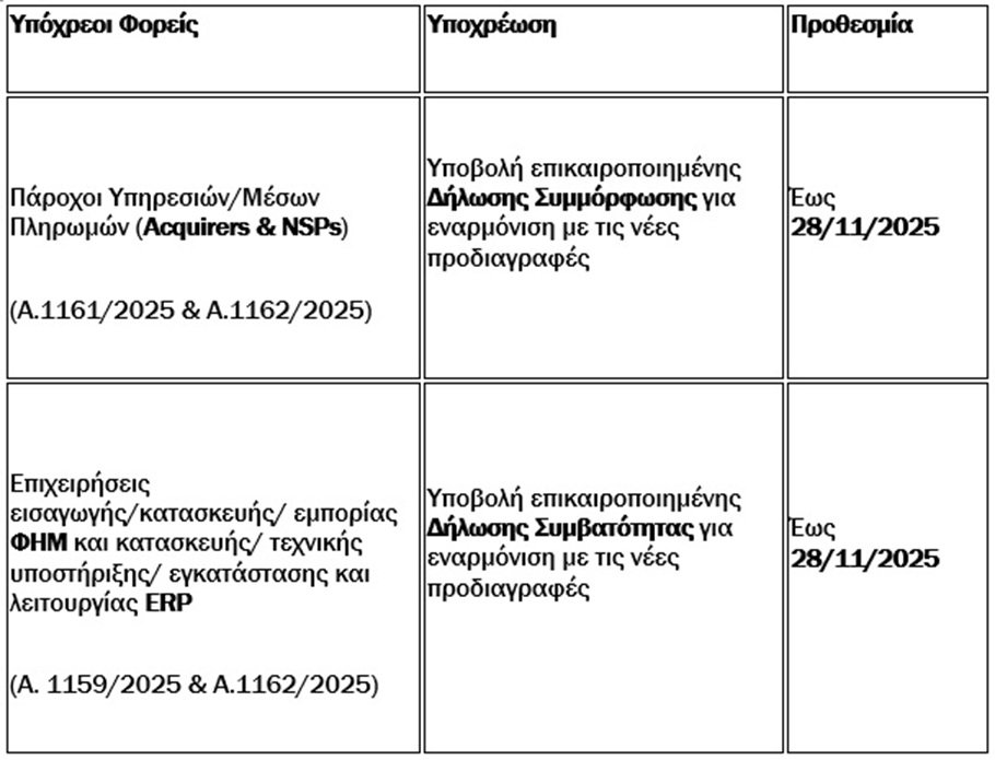 Περαιτέρω, σύμφωνα με την ΑΑΔΕ, καθορίζονται οι προθεσμίες συμμόρφωσης για τις εταιρείες τεχνολογίας και πληρωμών, ως ακολούθως: