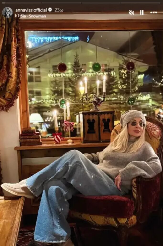 Σε μία από τις φωτογραφίες που δημοσίευσε στον προσωπικό της λογαριασμό στο Instagram, η Άννα Βίσση ποζάρει με φόντο το χιονισμένο τοπίο και τα έλατα, ενώ σε μια άλλη φωτογραφίζεται καθισμένη σε μια πολυθρόνα. Στο φωτογραφικό άλμπουμ από το ταξίδι της περιλαμβάνεται και ένα στιγμιότυπο με ένα από τα εγγόνια της που απαθανατίζεται μπροστά στο χριστουγεννιάτικο δέντρο.