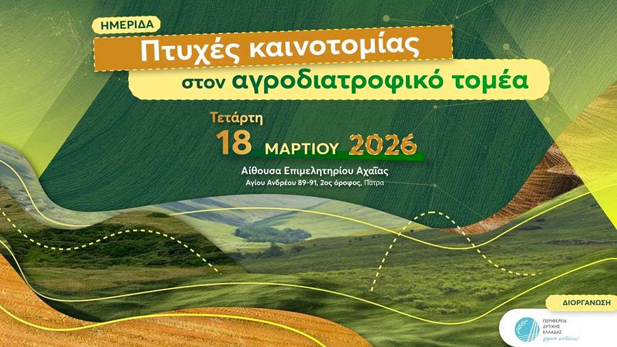 Tην Τετάρτη 18 Μαρτίου 2026 στην Αίθουσα του Επιμελητηρίου Αχαΐας, στις 10.00 π.μ, θα πραγματοποιηθεί ημερίδα με θέμα «Πτυχές καινοτομίας στον αγροδιατροφικό τομέα» συγκεντρώνοντας εκπροσώπους της επιστημονικής κοινότητας, της αυτοδιοίκησης και της επιχειρηματικότητας, με στόχο την ανάδειξη σύγχρονων τεχνολογικών και ερευνητικών εφαρμογών που ενισχύουν την ανάπτυξη του αγροδιατροφικού κλάδου.