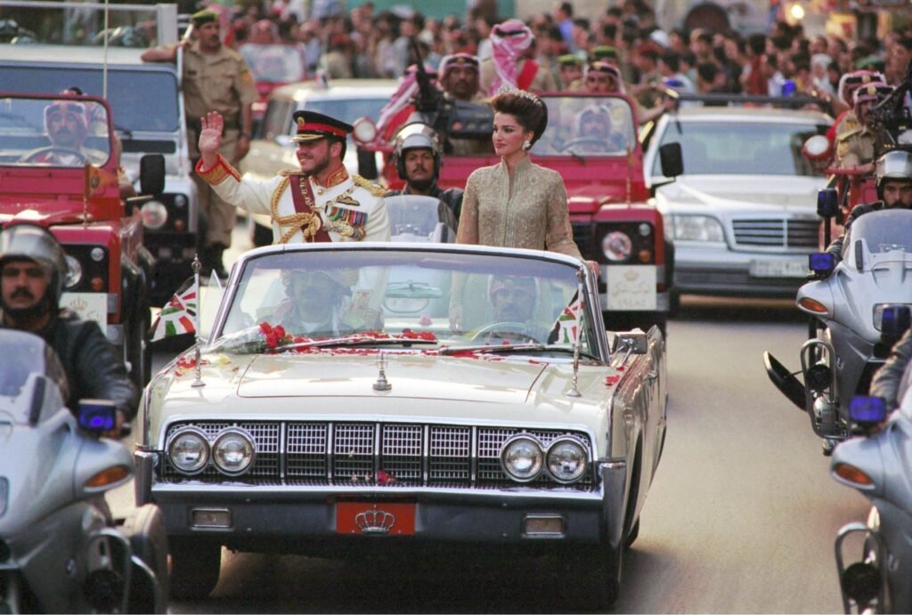 Ο Βασιλιάς Αμπντάλα και η Βασίλισσα Ράνια χαιρετούν τα πλήθη κατά την ενθρόνισή του το 1999.