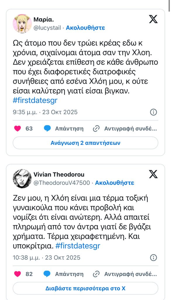 Υπάρχουν στιγμές στην τηλεόραση που δεν χρειάζεται να συμβεί τίποτα φοβερό για να καταλάβεις πόσο πίσω βρισκόμαστε. Μια κοπέλα σηκώνει το χέρι της για να φτιάξει τα μαλλιά της και ξαφνικά ολόκληρη η χώρα έχει γνώμη. Η Χλόη, η vegan του First Dates, μπήκε στο στούντιο με τη σιγουριά μιας γυναίκας που δεν έχει ανάγκη να αποδείξει τίποτα. Δεν ξύρισε τις μασχάλες της, δεν έκρυψε τον τρόπο ζωής της, δεν προσπάθησε να γίνει αρεστή. Και μέσα σε μερικά λεπτά κατάφερε να τινάξει στον αέρα ένα τηλεοπτικό ραντεβού που υποτίθεται φτιάχτηκε για να φέρνει ανθρώπους κοντά.