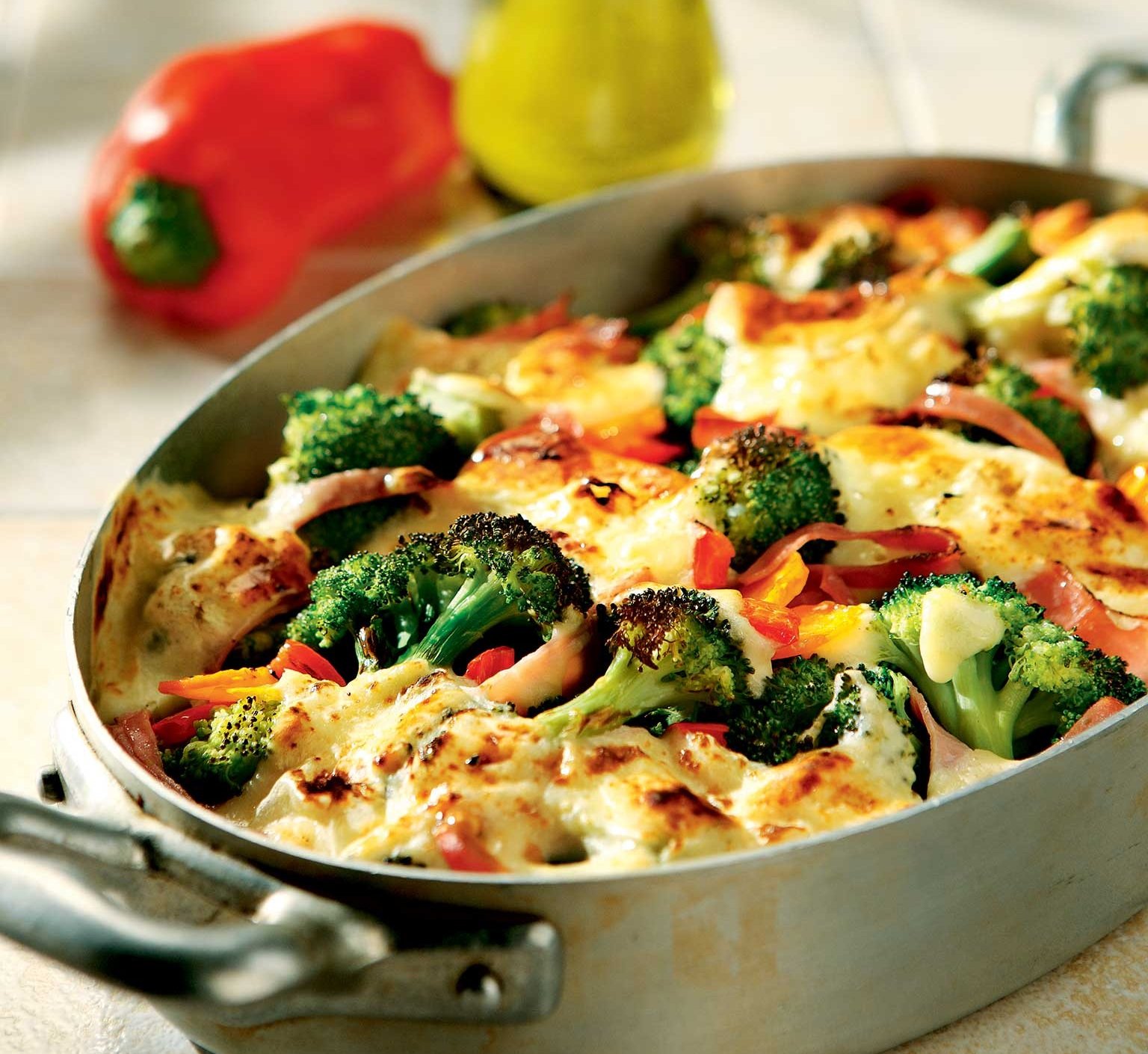Φουρνιστό μπρόκολο με καρότα, πιπεριές, ζαμπόν και μια ελαφριά σάλτσα γιαουρτιού που καθώς ψήνεται δημιουργεί μια ωραία, χρυσή κρούστα πάνω από τα λαχανικά.