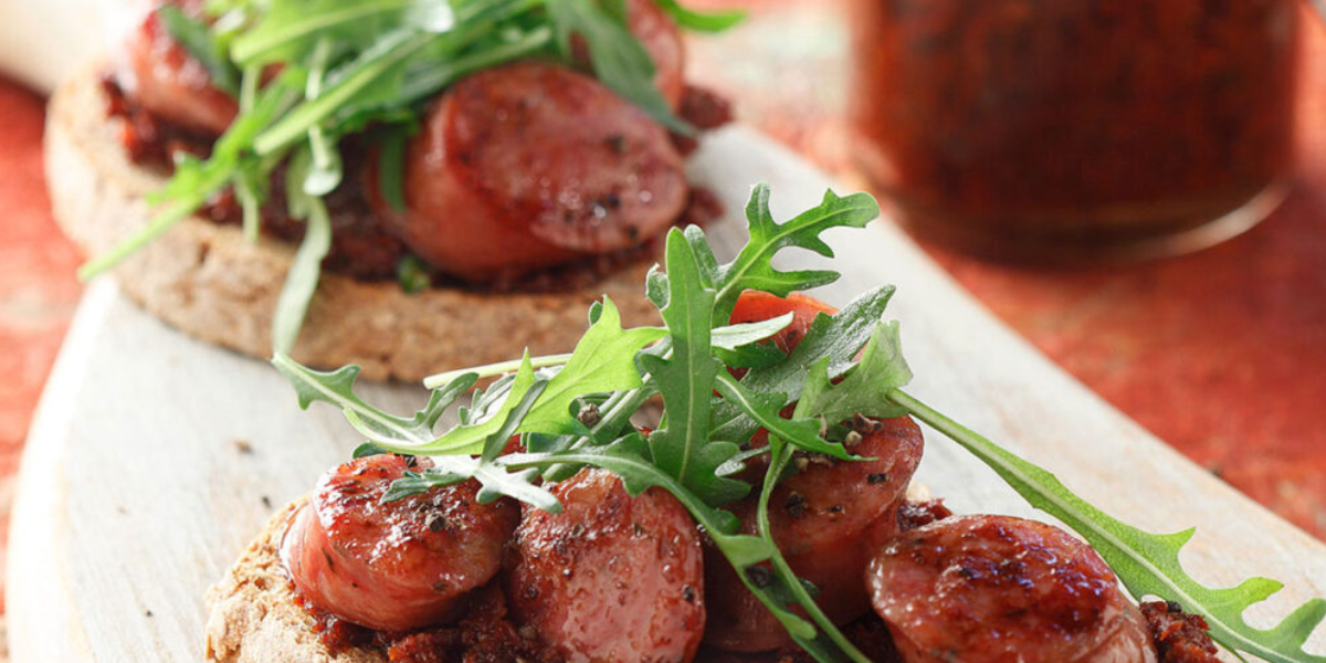 Μοιράζουμε τα λουκάνικα στις φέτες ψωμιού και γαρνίρουμε με τα φύλλα ρόκας.