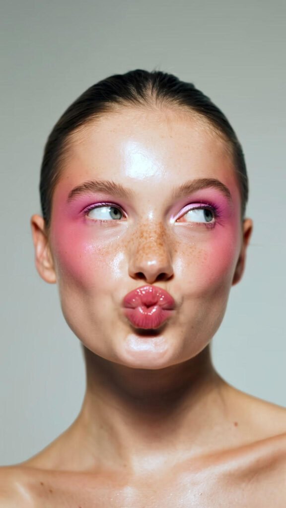 Εδώ όλα δείχνουν πιο «ζουμερά»,κρεμώδες ρουζ, glossy επιδερμίδα, νύχια με στρογγυλεμένο, σχεδόν candy-like τελείωμα.
