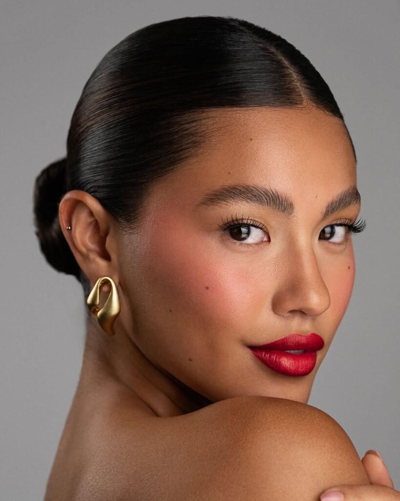 Έντονα χείλη, καθαρές γραμμές, μαλλιά με φόρμα και κίνηση. Όχι υπερβολή — αλλά έντονη παρουσία.