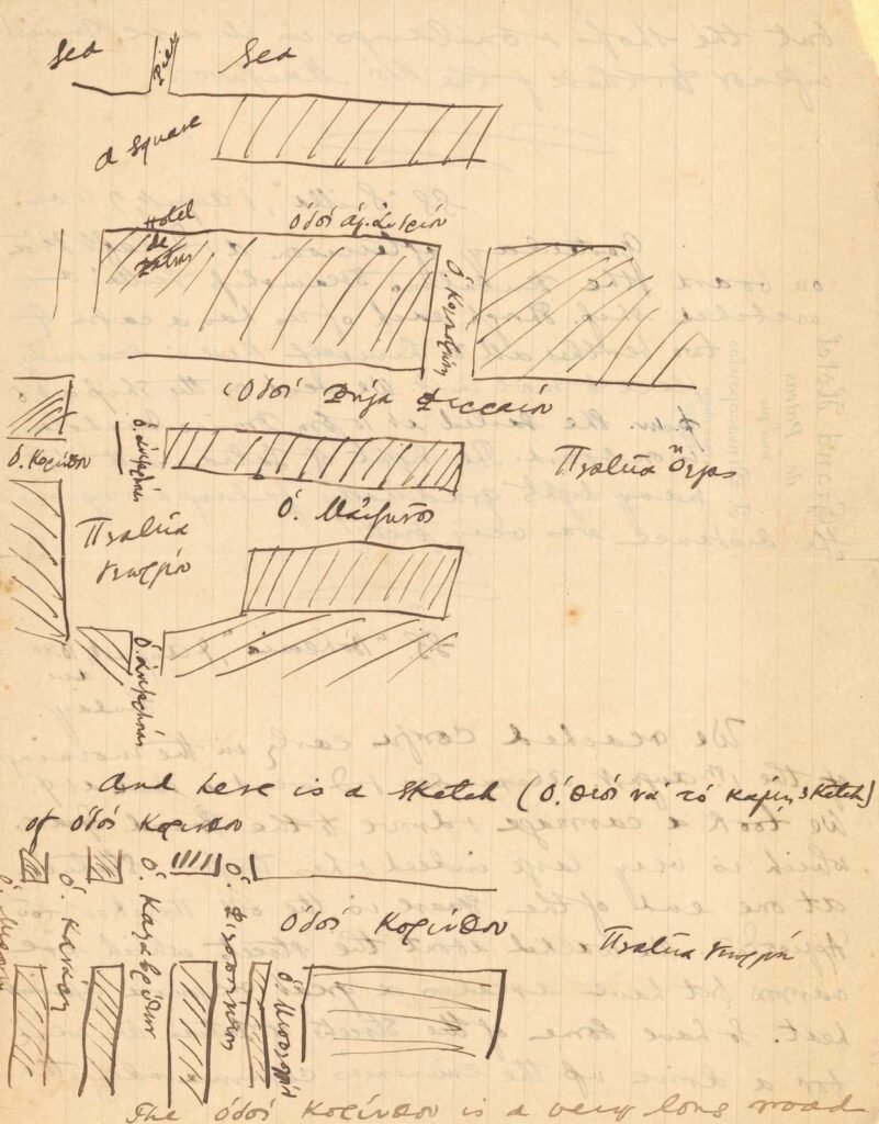 Τον Ιούνιο του 1901 ο Κωνσταντίνος Καβάφης πραγματοποίησε το πρώτο του ταξίδι στην Ελλάδα. Ύστερα από παραμονή αρκετών εβδομάδων στην Αθήνα, ο Καβάφης κατευθύνθηκε προς την Πάτρα με σκοπό να αναχωρήσει με το ιταλικό πλοίο «Σκύλα» για το Μπρίντιζι, όπου και θα επιβιβαζόταν σε έτερο πλοίο με προορισμό την Αλεξάνδρεια. Στην Πάτρα παρέμεινε τρεις ημέρες καταγράφοντας τις εντυπώσεις του και σχεδιάζοντας ένα σχεδιάγραμμα της πόλης.