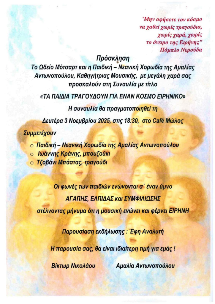 Το Ωδείο ΜΟΤΣΑΡΤ και η Παιδική-Νεανική Χορωδία της Αμαλίας Αντωνοπούλου, Καθηγήτριας Μουσικής, διοργανώνουν συναυλία με τίτλο: «ΤΑ ΠΑΙΔΙΑ ΤΡΑΓΟΥΔΟΥΝ ΓΙΑ ΕΝΑΝ ΚΟΣΜΟ ΕΙΡΗΝΙΚΟ».