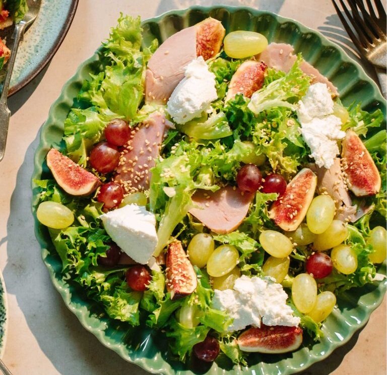 Τα πιο αγαπημένα φρούτα, τα σταφύλια και τα σύκα, γίνονται σαλάτα και εμπλουτίζονται με δροσερό, φρέσκο τυρί και εκλεκτό αλλαντικό για ένα πλούσιο, αλλά ελαφρύ γεύμα.