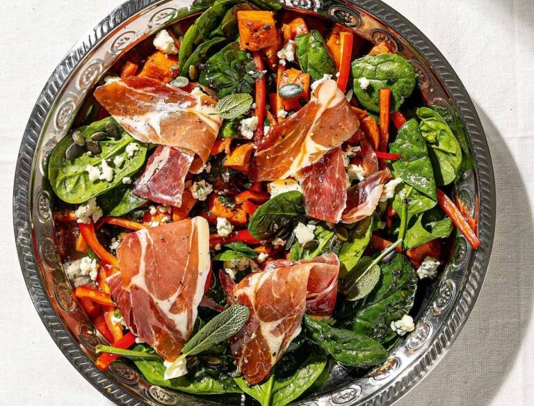 Μια πλουσιοπάροχη σαλάτα με σπέσιαλ υλικά, όλο χρώματα και αρώματα. Και τι δεν έχει: σπανάκι, φασκόμηλο, ψητές γλυκοπατάτες, μπλε τυρί, προσούτο…