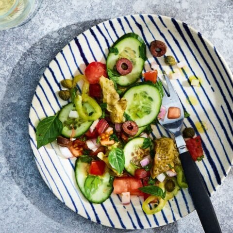 Ντοματοσαλάτα με μελιτζάνες ψητές, κάππαρη και ελιές