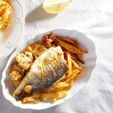 Λαβράκι στον φούρνο με κουνουπίδι και πατάτες