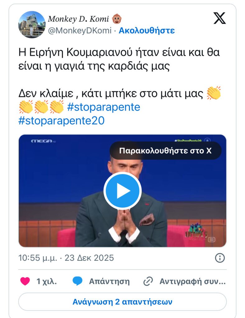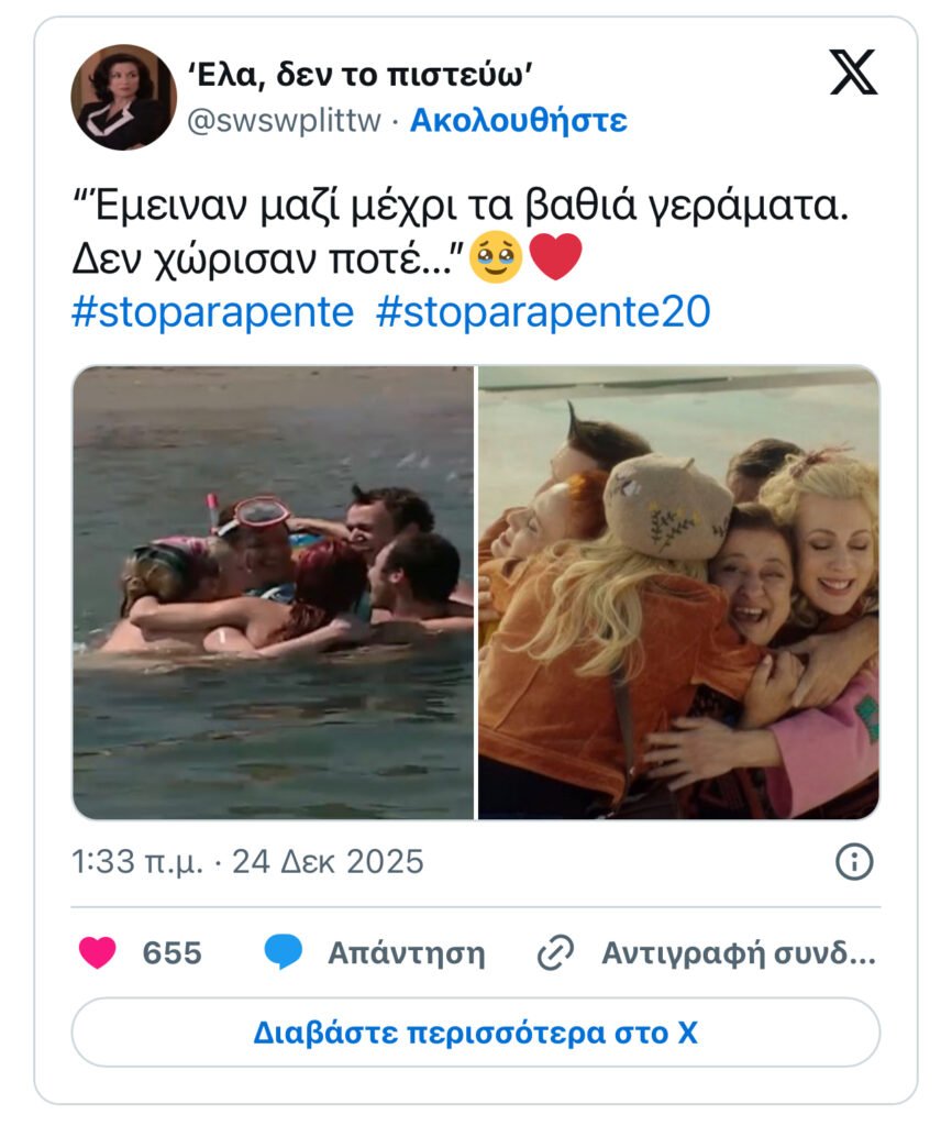 Η ψηφιακή διάσταση της βραδιάς επιβεβαίωσε το ίδιο συμπέρασμα. Το #stoparapente20 έγινε πρώτο trending topic στο X με περισσότερα από 50.000 tweets. Όχι ειρωνικά, όχι αποστασιοποιημένα, αλλά με έναν τόνο σχεδόν προστατευτικό, σαν το κοινό να ήθελε να φροντίσει κάτι δικό του. Η ζωντανή μετάδοση στο megatv.com ξεπέρασε τις 750.000 προβολές, ενώ η συνολική απήχηση της καμπάνιας άγγιξε τα 7,5 εκατομμύρια μοναδικούς χρήστες. Το reunion δεν περιορίστηκε στην τηλεόραση, εξαπλώθηκε αλλά χωρίς να αλλοιωθεί.
