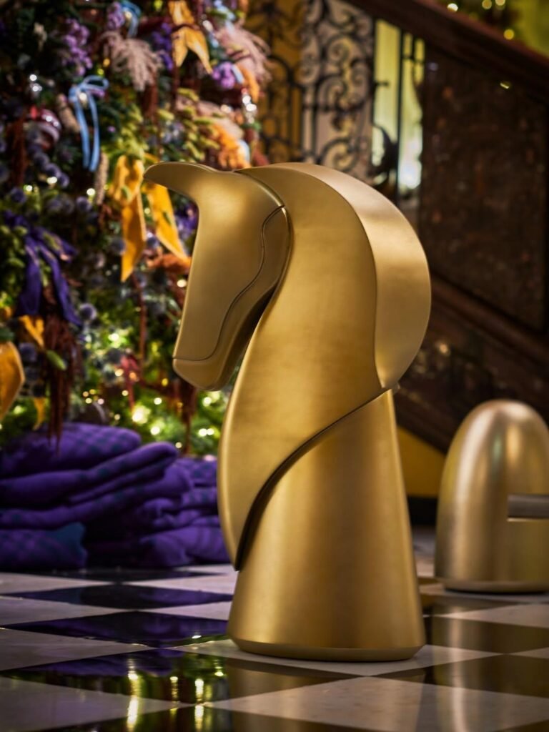 Η βάση του δέντρου όμως ήταν το σημείο που με κέρδισε. Ένα σκάκι σε υπερμεγέθη μορφή, με χρυσά πιόνια, απλωμένα μαξιλάρια, μια γωνιά που μοιάζει φτιαγμένη για να κάτσεις και να αφήσεις για λίγο το κινητό στην τσάντα σου. Ο Daniel Lee κατάφερε κάτι δύσκολο… έκανε το Claridge’s να νιώθει ακόμη πιο… Claridge’s.
